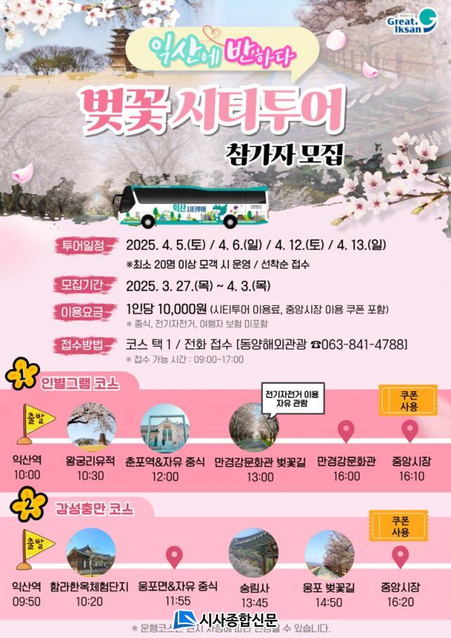 À̹ø ½ÃƼÅõ¾î´Â ÀÍ»êÀÇ ¾Æ¸§´Ù¿î º¢²É ¸í¼Ò¿Í ÀüÅë½ÃÀåÀ» ¿¬°èÇØ ±¸¼ºµÈ Ưº° ³ë¼±À¸·Î, º½ Á¤Ãë¿Í Áö¿ª »ó±ÇÀ» µ¿½Ã¿¡ Áñ±æ ¼ö ÀÖ´Ù. Âü°¡ºñ´Â 1¸¸ ¿øÀ̸ç, Âü¿© ½ÅûÀº ¿À´Â 4¿ù 3ÀϱîÁö ÀüÈ(063-841-4788)·Î ¼±Âø¼ø Á¢¼öÇÑ´Ù.