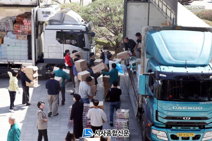 ºÏ±¸¿¡¼ ÁغñÇÑ ¡ã»ý¼ö(5,000°³) ¡ã»§(2,000°³) ¡ã¶ó¸é(315¹Ú½º) ¡ã¸¶½ºÅ©(42,000°³) ¡ã´ã¿ä(300°³) µî ÃÑ 5õ 2¹é¿©¸¸ ¿ø »ó´çÀÇ ±¸È£¹°Ç°À» ½ÇÀº Æ®·°ÀÌ ¿À´Ã ¿ÀÈÄ 3½Ã¿¡ »êû°ú Çϵ¿À¸·Î Ãâ¹ßÇß´Ù.