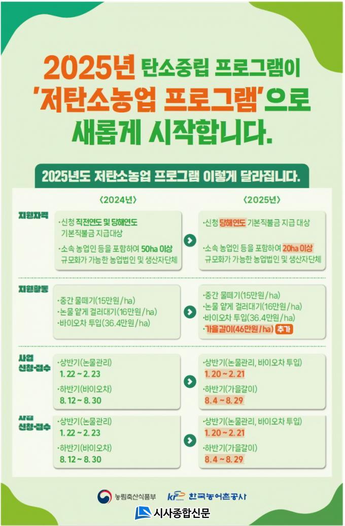 Àúź¼Ò³ó¾÷ ÇÁ·Î±×·¥Àº Áß°£ ¹°¶¼±â, ³í¹° ¾è°Ô °É·¯´ë±â, ¹ÙÀÌ¿ÀÂ÷ ÅõÀÔ µî Àúź¼Ò ¿µ³óȰµ¿À» ÇÑ ³ó°¡¿¡ Ȱµ¿ºñ¸¦ Áö¿øÇÏ´Â »ç¾÷ÀÌ´Ù. ¿ÃÇØºÎÅÍ °¡À»°¥À̰¡ Ãß°¡µÆ´Ù. °¡À»°¥ÀÌ È°µ¿Àº ÇϹݱ⿡ ½Åû¹ÞÀ» ¿¹Á¤ÀÌ´Ù.