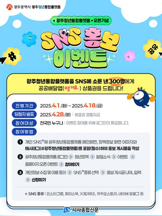 ±¤Áֽô ±¤ÁÖû³âÅëÇÕÇ÷§ÆûÀÇ ÀÌ¿ëÀÚ È®´ë¿Í ÀÎÁöµµ Çâ»óÀ» À§ÇØ 1ÀϺÎÅÍ ¿À´Â 18ÀϱîÁö »çȸ°ü°è¸Á¼ºñ½º(SNS) È«º¸ À̺¥Æ®¸¦ ÁøÇàÇÑ´Ù. À̺¥Æ® Âü°¡ÀÚ Áß Ãß÷À» ÅëÇØ 300¸í(3¸¸¿ø±Ç 30¸í, 1¸¸¿ø±Ç 270¸í)¿¡°Ô °ø°ø¹è´Þ¾Û ¡®¶¯°Ü¿ä¡¯ »óǰ±ÇÀ» Áö±ÞÇϸç, 28ÀÏ ±¤ÁÖû³âÅëÇÕÇ÷§Æû¿¡¼ ´ç÷ÀÚ¸¦ ¹ßÇ¥ÇÒ ¿¹Á¤ÀÌ´Ù.