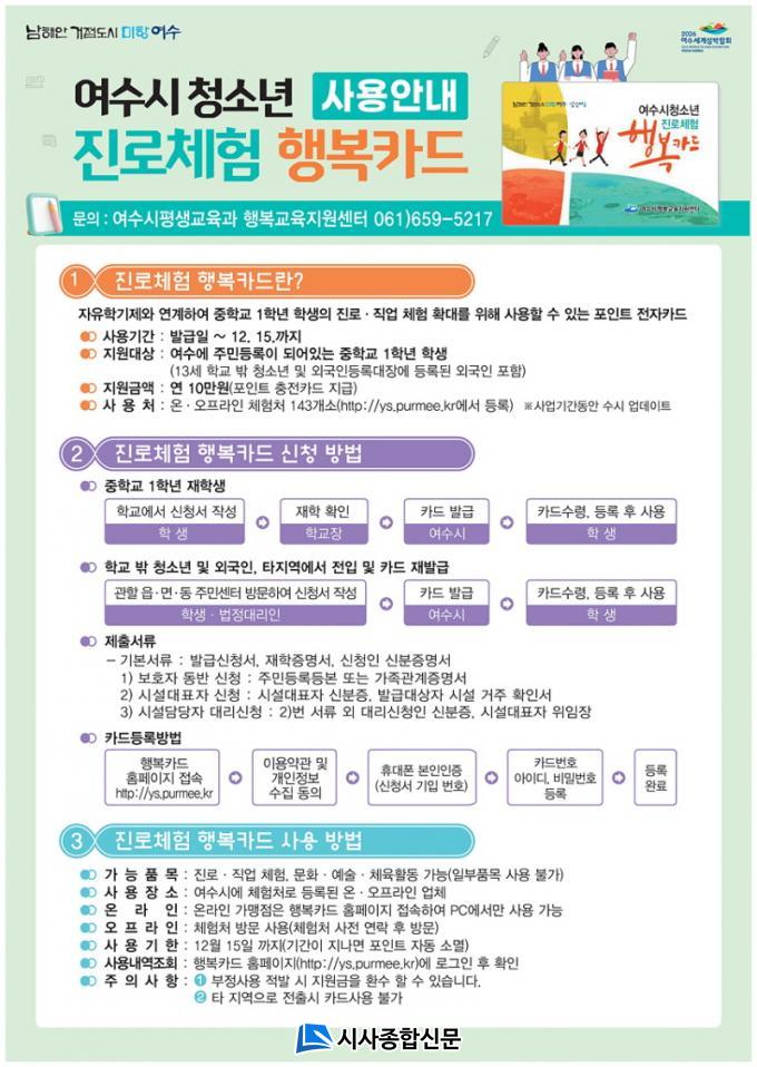 | ¿©¼ö½Ã, û¼Ò³â Áø·ÎüÇè Çູīµå Áö¿ø»ç¾÷ ÃßÁø ÁßÇб³ 1Çгâ ÀçÇлý ¹× 13¼¼ Çб³ ¹Û û¼Ò³â ´ë»ó |