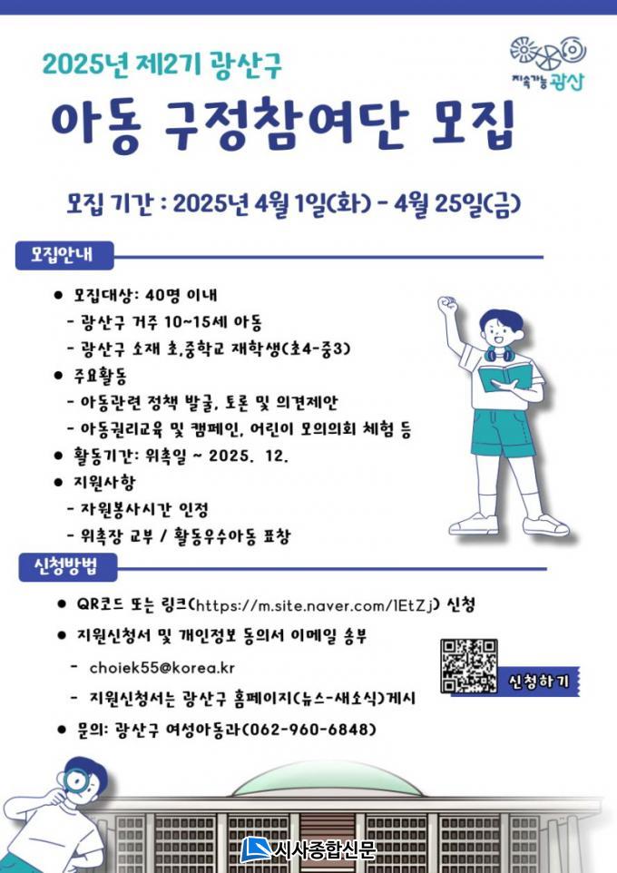 ¾Æµ¿ ±¸Á¤Âü¿©´ÜÀº ¾ÆÀ̵éÀÇ ´«³ôÀÌ¿¡¼ ¾Æµ¿ Á¤Ã¥¿¡ ´ëÇØ ´Ù¾çÇÑ ÀǰßÀ» Á¦½ÃÇϰí, Á¤Ã¥¿¡ ¹Ý¿µµÉ ¼ö ÀÖµµ·Ï ±¸¼ºÇÑ ¾Æµ¿ Âü¿©±â±¸´Ù. ¸ðÁý ´ë»óÀº ±¤»ê±¸¿¡ °ÅÁÖÇϰųª ±¤»ê±¸ ¼ÒÀç Çб³¿¡ ÀçÇÐ ÁßÀÎ 10¼¼¡15¼¼ ¾Æµ¿(ÃÊ4¡Áß3) 40¸íÀ» ¼±¹ßÇÑ´Ù.