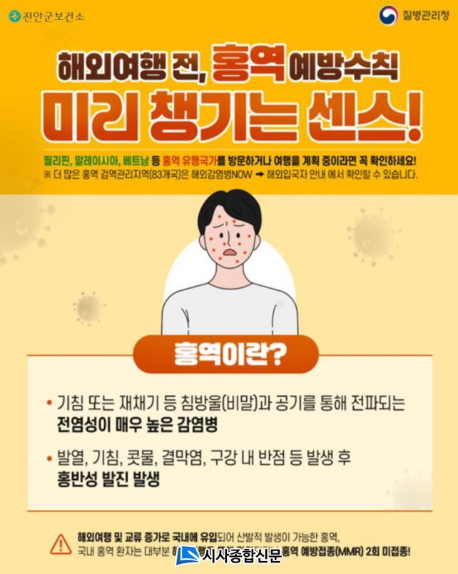 ƯÈ÷, 12°³¿ù ¹Ì¸¸ÀÇ ¿µÀ¯¾ÆÀÇ °æ¿ì È«¿ª °¨¿° ½Ã Æó·Å°ú ÁßÀÌ¿° µî ÇÕº´Áõ ¹ß»ý À§ÇèÀÌ ³ô¾Æ ¹Ì¸® È«¿ª¿¹¹æÁ¢Á¾À» ½Ç½ÃÇϰųª(°¡¼ÓÁ¢Á¾ °¡´É) È«¿ªÀÌ À¯ÇàÇÏ´Â ±¹°¡ ¹æ¹®À» ÀÚÁ¦ÇÏ´Â °ÍÀÌ ¹Ù¶÷Á÷ÇÏ´Ù°í ¹àÇû´Ù. ÇöÀç Áø¾È±º¿¡¼´Â Áø¾È±ºÀÇ·á¿ø, ¿ì¸®°¡Á¤ÀÇÇаú µî °ü³» ÀÇ·á±â°ü 2°³¼Ò¿¡¼ À¯·á·Î ¹é½ÅÁ¢Á¾À» ¹ÞÀ» ¼ö ÀÖ´Ù.