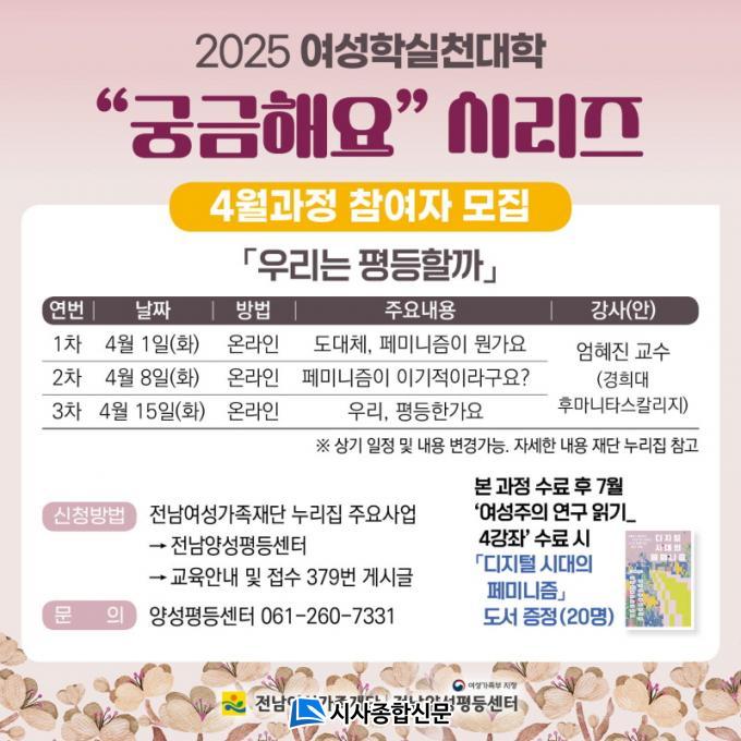 ¼ºÇý¶õ ¿øÀå(Àü³²¿©¼º°¡Á·Àç´Ü)Àº ¡°À̹ø ¿©¼ºÇнÇõ´ëÇÐÀº ÀÏ»ó»ýȰ¿¡¼ÀÇ ¼ºÆòµîÀ» µµ¹Î°ú °ø·ÐÈÇϱâ À§ÇÑ °úÁ¤À¸·Î ¸¶·ÃÇÏ¿´½À´Ï´Ù. »çȸ Çö»óÀ» ±âÁ¸ °ü½À´ë·Î°¡ ¾Æ´Ñ ´Ù¾çÇÑ ½Ã°¢À¸·Î ¹Ù¶óº¼ ¼ö ÀÖ°Ô °üÁ¡À» È®´ëÇÏ´Â °è±â°¡ µÇ¾î ´©±¸³ª ÆòµîÇϰí Á¸Áß¹Þ´Â ÇູÇÑ Àü³²ÀÌ µÇ±â¸¦ ±â´ëÇÕ´Ï´Ù.¡±°í ¹àÇû´Ù.