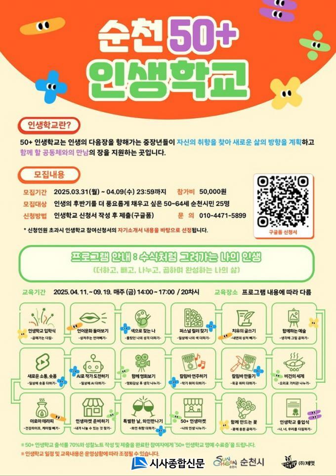 | ¼øÃµ½Ã, ½ÅÁ߳⠻õ·Î¿î ¼¼»ó ¸¸³ª±â, ¼øÃµ ¡¸50+ÀλýÇб³¡¹ ¼ö°»ý ¸ðÁý »ý¾Ö Àüȯ±â ½ÅÁß³â(50~64¼¼)ÀÇ Á¦2Àλý ¹æÇâ¼³Á¤À» µ½´Â ±³À° ¿î¿µ |