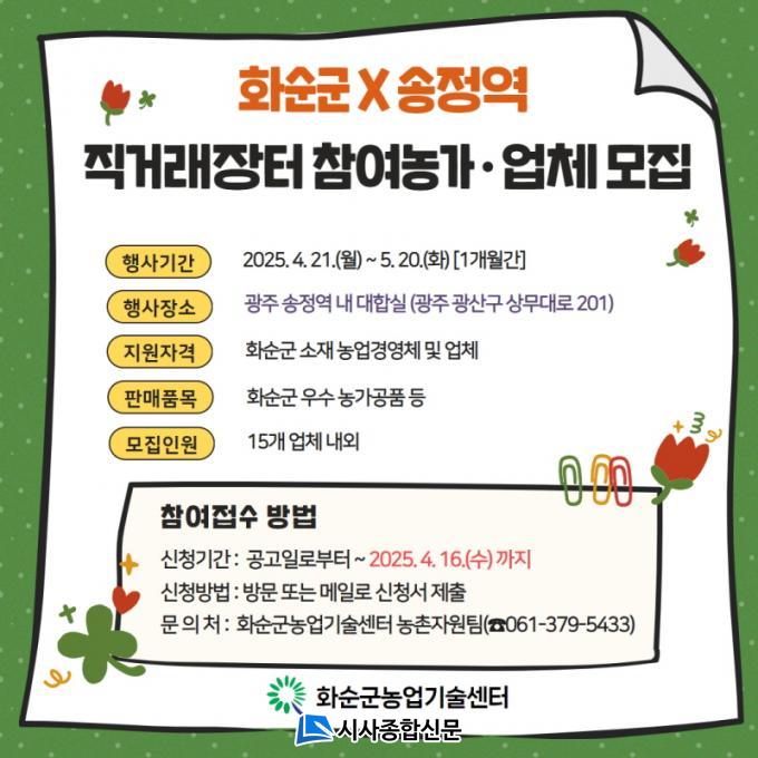 [½Ã»çÁ¾ÇսŹ® = ¿À½ÂÅà ±âÀÚ] ȼø±º(±º¼ö ±¸º¹±Ô)Àº 4¿ù 21ÀϺÎÅÍ 5¿ù 20ÀϱîÁö 1´Þ°£ ±¤ÁÖ ¼ÛÁ¤¿ª¿¡¼ ÃßÁø ¿¹Á¤ÀÎ ¡®¼ÛÁ¤¿ª °íÇâ¶ß¶ô¡¯ Á÷°Å·¡ÀåÅÍ¿¡ Âü¿©ÇÒ ¿ì¼ö ³ó¾÷°æ¿µÃ¼ 15°³¼Ò¸¦ 4¿ù 16ÀϱîÁö ¸ðÁýÇÑ´Ù°í ¹àÇû´Ù.