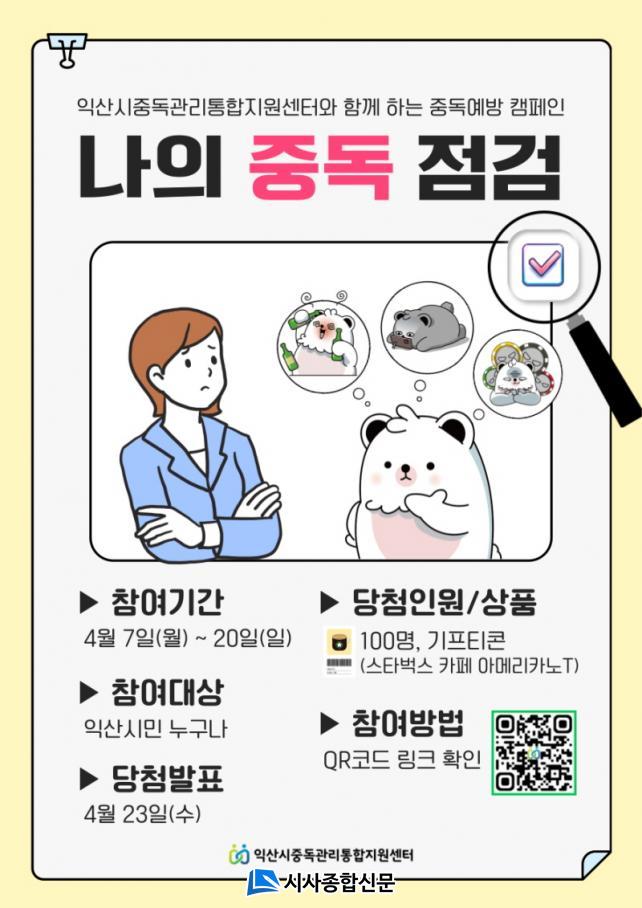 ÁÖ¿ä ³»¿ëÀº ¡âÁßµ¶ ¹Ù·Î¾Ë±â OX ÄûÁî ¡âÁßµ¶ ÀÚ°¡°ËÁø(¾ËÄÚ¿Ã, µµ¹Ú, ÀÎÅͳݡ¤½º¸¶Æ®Æù, ¾à¹° Áß ÅÃ1) µîÀ¸·Î ±¸¼ºµÆ´Ù. Ä·ÆäÀÎÀº ÀÍ»ê½ÃÁßµ¶°ü¸®ÅëÇÕÁö¿ø¼¾ÅÍ ´©¸®Áý¿¡ °Ô½ÃµÈ ºü¸¥ ÀÀ´ä(QRÄÚµå)À» ÅëÇØ Âü¿©ÇÏ¸é µÈ´Ù.