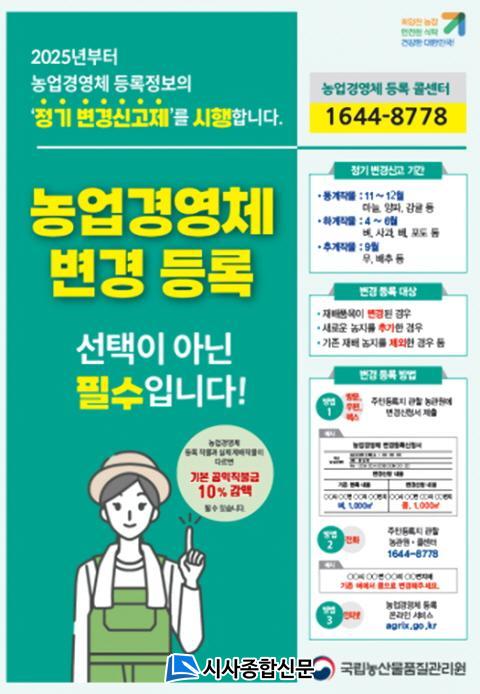 ³ó¾÷°æ¿µÃ¼ µî·Ï ³ó¾÷ÀÎÀº °øÀÍÁ÷ºÒ µî ³ó¾÷ °ü·Ã À¶ÀÚ¡¤º¸Á¶ »ç¾÷* Áö¿øÇýÅÃÀ» ¹Þ´Â ´ë½Å ³ó¾î¾÷°æ¿µÃ¼¹ý Á¦4Á¶¿¡ µû¶ó º¯°æµî·ÏÀÇ Àǹ«°¡ ÁÖ¾îÁø´Ù. ÀÌ´Â Á¤È®ÇÑ ³ó¾÷°æ¿µÃ¼ µî·ÏÁ¤º¸¸¦ Åä´ë·Î Á¤Ã¥Áö¿øÀ» ÃßÁøÇÏ°í ³ó»ê¹° ¼ö±Þ µî Á¤Ã¥ ±âÃÊÀÚ·á·Î Ȱ¿ëÇÏ´Â µî ³óÁ¤ ¹ßÀüÀÇ ¼±¼øÈ¯ ±¸Á¶¸¦ ¸¸µé±â À§ÇÑ ¹æ¾ÈÀÌ´Ù. ÇÏÁö¸¸ ¹Ù»Û ¿µ³óȰµ¿°ú Àǹ«¿¡ ´ëÇÑ ÀÎ½Ä ºÎÁ· µîÀ¸·Î ³ó¾÷ÀÎÀÌ Á¦¶§ º¯°æµî·ÏÀ» ÇÏÁö ¾Ê°í ÀÖ¾î Áö¿ø »ç¾÷¿¡¼ ¹èÁ¦µÇ´Â µîÀÇ ºÒÀÌÀÍÀ» ¹ÞÀ» ¿ì·Á°¡ ÀÖ´Ù.