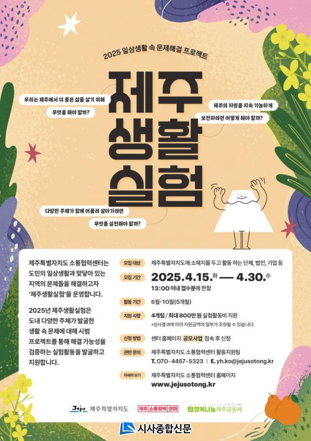 ¸ðÁý ´ë»óÀº Á¦ÁÖÆ¯º°ÀÚÄ¡µµ¿¡ ¼ÒÀ縦 µÎ°í Ȱµ¿Çϸç, Á¦¾ÈÇÑ ÇÁ·ÎÁ§Æ®¿¡ ´ëÇÑ Àü¹®¼º°ú °æÇèÀ» ¹ÙÅÁÀ¸·Î Áö¿ª¹®Á¦¸¦ ÇØ°áÇØ º¸°íÀÚ ÇÏ´Â ´Üü, ¹ýÀÎ, ±â¾÷ µîÀÌ´Ù. ÃÑ 4°³ÆÀÀ» ¼±Á¤Çϸç, Á¦ÁÖ¼ÒÅëÇù·Â¼¾ÅÍ È¨ÆäÀÌÁö(www.jejusotong.kr)¸¦ ÅëÇØ ½ÅûÇÒ ¼ö ÀÖ´Ù.