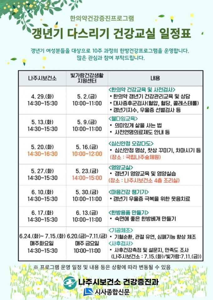 À̹ø ÇÁ·Î±×·¥Àº ³ªÁֽÿ¡ °ÅÁÖÇÏ´Â ¸¸ 40¼¼ºÎÅÍ 64¼¼±îÁöÀÇ Á߳⠿©¼ºÀ» ´ë»óÀ¸·Î 4¿ù 29ÀϺÎÅÍ 7¿ù 15ÀϱîÁö ¸ÅÁÖ 1ȸ¾¿ ÃÑ 10ÁÖ°£ ¿î¿µµÇ¸ç ³ªÁֽú¸°Ç¼Ò¿Í ºû°¡¶÷°Ç°»ýȰÁö¿ø¼¾ÅÍ¿¡¼ º´Çà ÁøÇàµÉ ¿¹Á¤ÀÌ´Ù.
