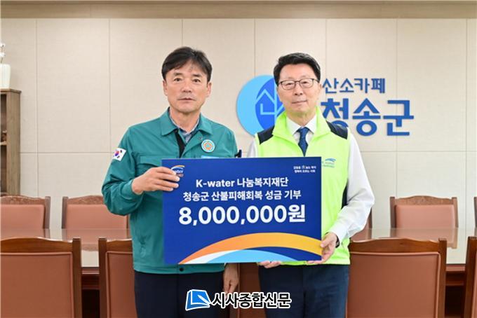 [½Ã»çÁ¾ÇսŹ® = ¿À½ÂÅà ±âÀÚ] K-water ³ª´®º¹ÁöÀç´Ü(´ëÇ¥ÀÌ»ç ±èÁöÂù)Àº ÃÖ±Ù °æºÏÁö¿ª »êºÒÇÇÇØ º¹±¸¸¦ À§ÇØ Àç´Ü»ç¹«±¹°ú »êÇÏ 9°³ ´ï³ëÀκ¹Áö°ü Á÷¿øµé, ±×¸®°í º¹Áö°ü ÀÌ¿ë ¾î¸£½ÅµéÀÇ ÀÚ¹ßÀûÀÎ ¸ð±Ý µ¿ÂüÀ¸·Î ¸¶·ÃµÈ ¼º±Ý 800¸¸¿øÀ» û¼Û±º¿¡ Àü´ÞÇß´Ù°í ¹àÇû´Ù.