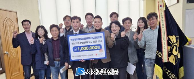[½Ã»çÁ¾ÇսŹ® = ¿À½ÂÅà ±âÀÚ] ¹ÎÁÖÆòÈÅëÀÏÀÚ¹®È¸ÀÇ Áøµµ±ºÇùÀÇȸ(ȸÀå ±è³²Áß)°¡ ÃÖ±Ù ¹ß»ýÇÑ ¿µ³² Áö¿ª »êºÒ ÇÇÇØ º¹±¸ Áö¿øÀ» À§ÇØ Àü³²»çȸº¹Áö°øµ¿¸ð±Ýȸ »ç¶ûÀÇ ¿¸Å¿¡ ¼º±Ý 100¸¸¿øÀ» ±âŹ Çß´Ù.