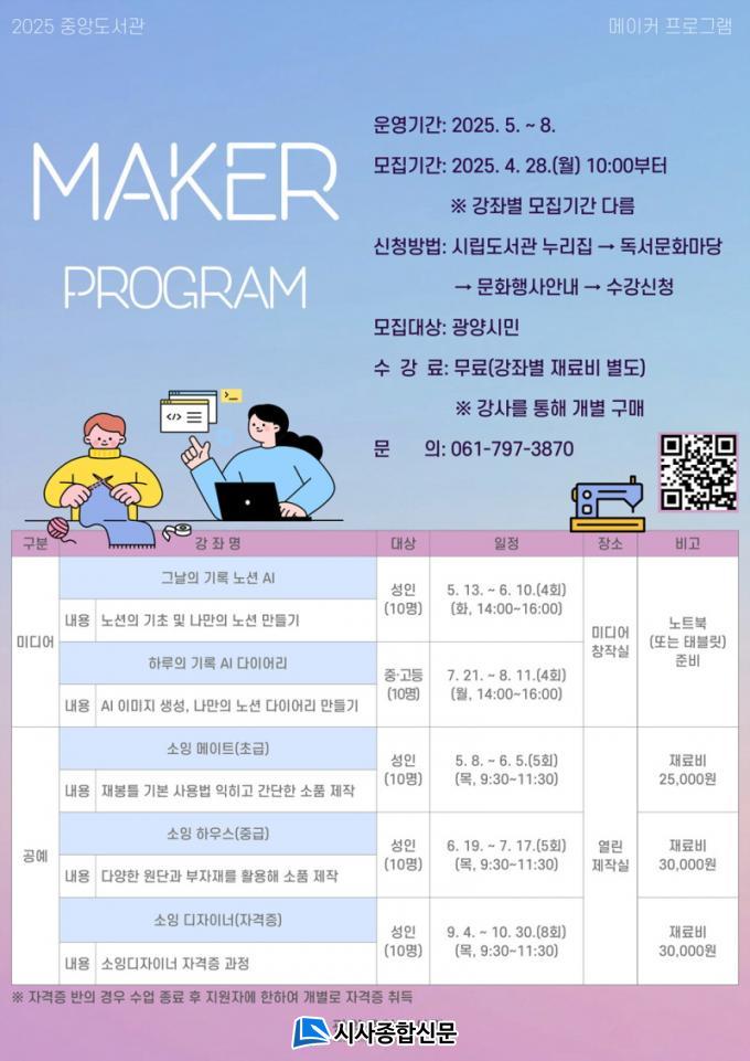 ÇÁ·Î±×·¥ Á¢¼ö´Â ¿À´Â 4¿ù 28ÀϺÎÅÍ °Áº°·Î ÁøÇàµÇ¸ç, ÇÁ·Î±×·¥°ú °ü·ÃÇØ ÀÚ¼¼ÇÑ »çÇ×Àº ±¤¾ç½Ã¸³µµ¼°ü ´©¸®Áý(http://lib.gwangyang.go.kr)À» È®ÀÎÇϰųª ±¤¾çÁß¾Óµµ¼°ü(¢Ï061-797-3870)À¸·Î ¹®ÀÇÇÏ¸é ¾È³»¹ÞÀ» ¼ö ÀÖ´Ù.