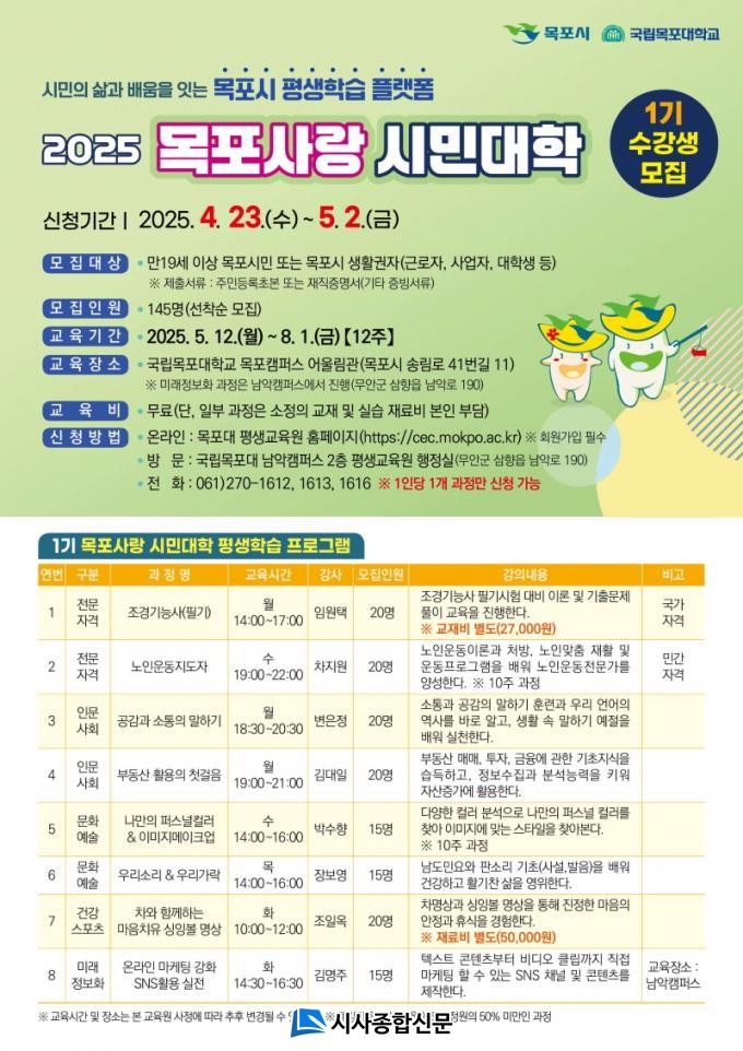 ½Ã¹Î´ëÇÐÀº ¿¬ 2ȸ ¿î¿µµÇ¸ç, ¿ÃÇØ´Â »ó¹Ý±â 1±â(5~8¿ù), ÇϹݱâ 2±â(9~11¿ù)·Î ÁøÇàµÈ´Ù. 5¿ù 12ÀÏ ±¹¸³¸ñÆ÷´ëÇб³ ¸ñÆ÷Ä·ÆÛ½º¿¡¼ °³°½ÄÀ» °³ÃÖÇÒ ¿¹Á¤À¸·Î, 1±âÀÇ ±³À°±â°£Àº 5¿ù 12ÀϺÎÅÍ 8¿ù 1ÀϱîÁö 12ÁÖ°£À̸ç, ¼ö°·á´Â ¹«·á´Ù.