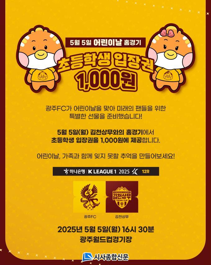 ±¤ÁÖFC´Â ¿À´Â 5¿ù 5ÀÏ(¿ù) ¿ÀÈÄ 4½Ã 30ºÐ ±¤ÁÖ¿ùµåÄŰæ±âÀå¿¡¼ ¿¸®´Â ±èõ»ó¹«¿ÍÀÇ È¨°æ±â¿¡ ÃʵîÇлý ÀÔÀå±ÇÀ» 1,000¿ø¿¡ ÆÇ¸ÅÇÑ´Ù°í ¹àÇû´Ù.