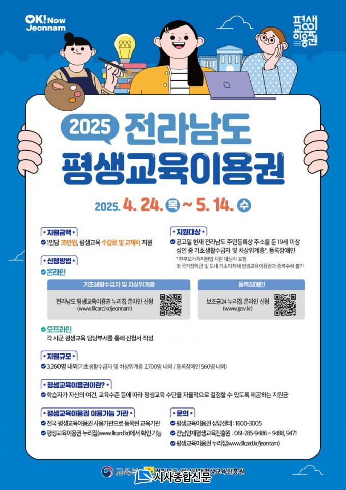 ÀÌ¿ë±Ç ½ÅûÀº ¿Â¶óÀΰú ¿ÀÇÁ¶óÀÎ ¸ðµÎ °¡´ÉÇÏ´Ù. ±âÃÊ»ýȰ¼ö±ÞÀÚ ¹× Â÷»óÀ§°èÃþÀº ¡®Àü¶ó³²µµ Æò»ý±³À°ÀÌ¿ë±Ç ´©¸®Áý(www.lllcard.kr/jeonnam)¡¯, µî·ÏÀå¾ÖÀÎÀº ¡®º¸Á¶±Ý24 ´©¸®Áý(www.gov.kr)¡¯À» ÅëÇØ ¿Â¶óÀÎÀ¸·Î ½ÅûÇÒ ¼ö ÀÖÀ¸¸ç, ¿ÀÇÁ¶óÀÎ ½ÅûÀº ±¤¾ç½Ãû Ä¿¹Â´ÏƼ¼¾ÅÍ 5Ãþ ±³À°Ã»¼Ò³â°ú Æò»ýÇнÀÆÀÀ» ¹æ¹®ÇÏ¸é µÈ´Ù.