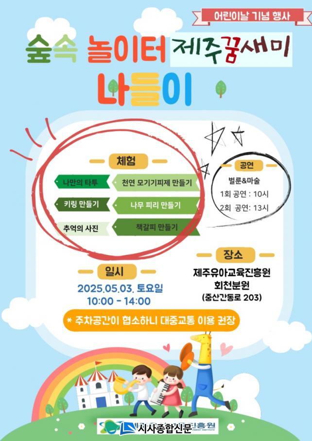 [½Ã»çÁ¾ÇսŹ® = °í¼º¹Î ±âÀÚ] Á¦ÁÖÀ¯¾Æ±³À°ÁøÈï¿ø(¿øÀå ±èÈñÁ¤)Àº ³»´Þ 3ÀÏ ¿ÀÀü 10½ÃºÎÅÍ ¿ÀÈÄ 2½Ã±îÁö Á¦ÁÖ²Þ»õ¹Ì(Á¦ÁÖÀ¯¾Æ±³À°ÁøÈï¿ø ȸõºÐ¿ø)¿¡¼ ¾î¸°À̳¯ Çà»ç ¡®½£¼Ó ³îÀÌÅÍ Á¦ÁÖ²Þ»õ¹Ì ³ªµéÀÌ¡¯¸¦ ¿î¿µÇÑ´Ù.