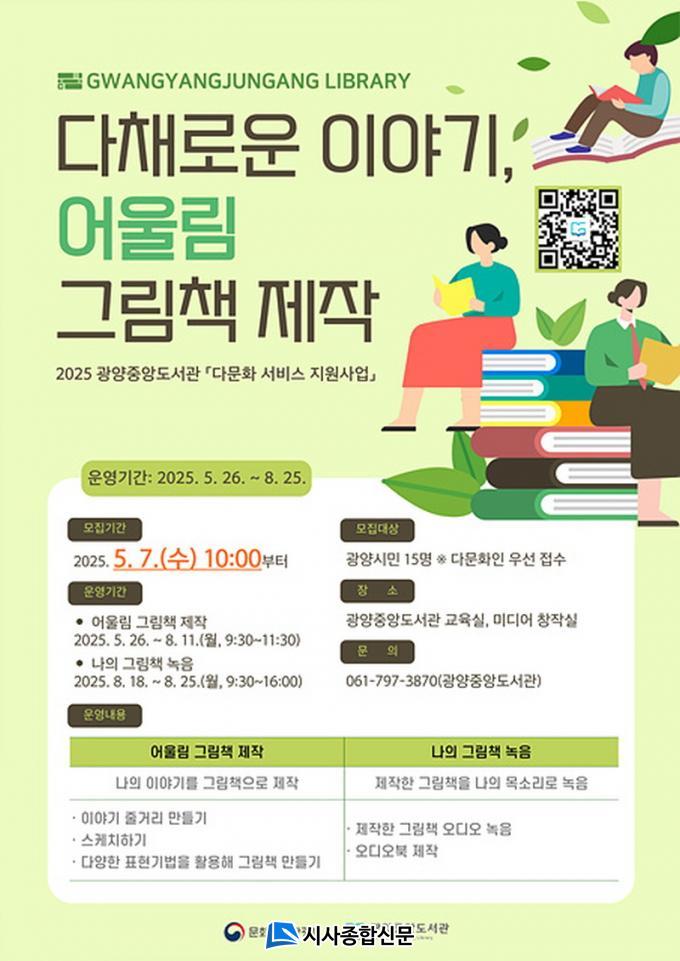 ¡®´Ùä·Î¿î À̾߱â, ¾î¿ï¸² ±×¸²Ã¥ Á¦ÀÛ¡¯Àº ±¤¾ç½Ã °ÅÁÖ ´Ù¹®ÈÀÎ ´©±¸³ª Âü¿©ÇÒ ¼ö ÀÖÀ¸¸ç, 5¿ù 7ÀϺÎÅÍ ±¤¾ç½Ã¸³µµ¼°ü ´©¸®Áý ¶Ç´Â ÀüÈ(¢Ï797-3870)¸¦ ÅëÇØ ½Åû °¡´ÉÇÏ´Ù. ÇÁ·Î±×·¥ ¼¼ºÎ ÀÏÁ¤°ú ¿î¿µ ¹æ½Ä µî ÀÚ¼¼ÇÑ »çÇ×Àº ÀüÈ ¹®ÀǸ¦ ÅëÇØ ¾È³»¹ÞÀ» ¼ö ÀÖ´Ù.