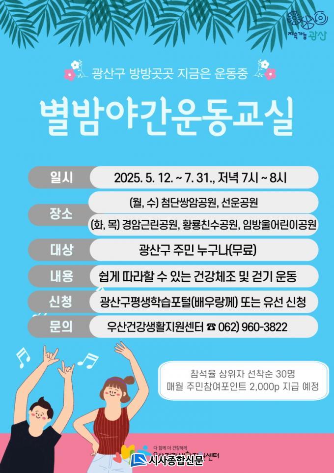 ¿îµ¿ÇÒ ½Ã°£ÀÌ ºÎÁ·ÇÑ ½Ã¹Î¿¡°Ô °Ç°ÇÑ ½ÅüȰµ¿ ±âȸ¸¦ Á¦°øÇϱâ À§ÇØ ¸¶·ÃÇÑ ÇÁ·Î±×·¥ÀÌ´Ù. 5¿ù 12ÀϺÎÅÍ 7¿ù ¸»±îÁö ÷´Ü ½Ö¾Ï±Ù¸°°ø¿ø, ¼±¿î±Ù¸°°ø¿ø, °æ¾Ï±Ù¸°°ø¿ø, Ȳ·æÄ£¼ö°ø¿ø, ÀÓ¹æ¿ï¾î¸°À̰ø¿ø µî ±¤»ê±¸ 5°³ °ø¿ø¿¡¼ ÁÖ 2ȸ Àú³á 7½ÃºÎÅÍ 8½Ã±îÁö ¿î¿µÇÑ´Ù.