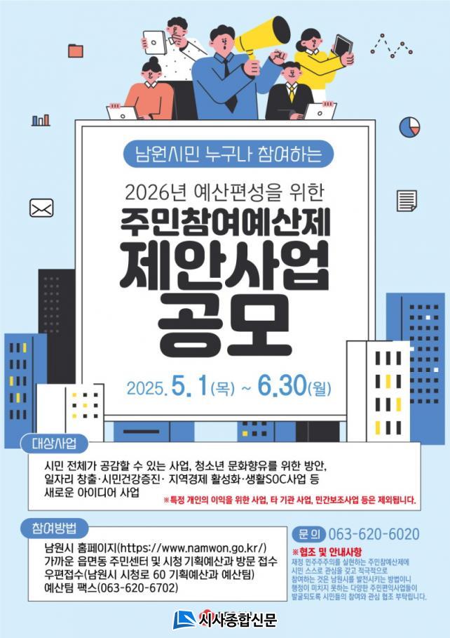 °ø¸ð ±Ô¸ð´Â ÃÑ 20¾ï ¿øÀÌ¸ç ³²¿ø½Ã¹Î ´©±¸³ª Âü¿©ÇÒ ¼ö ÀÖ´Ù. ½ÅûÀº ³²¿ø½Ã ´©¸®Áý(Á¤º¸°ø°³ > ÁÖ¹ÎÂü¿©¿¹»ê > ¿¹»ê»ç¾÷Á¦¾È) ¿Â¶óÀÎ Á¢¼ö, ±âȹ¿¹»ê°ú, °¢ À¾¡¤¸é¡¤µ¿ ÇàÁ¤º¹Áö¼¾ÅÍ¿¡ ¹æ¹® ¶Ç´Â ¿ìÆí Á¢¼ö µîÀ¸·Î ¿Â¿ÀÇÁ¶óÀÎ ¸ðµÎ °¡´ÉÇÏ´Ù.