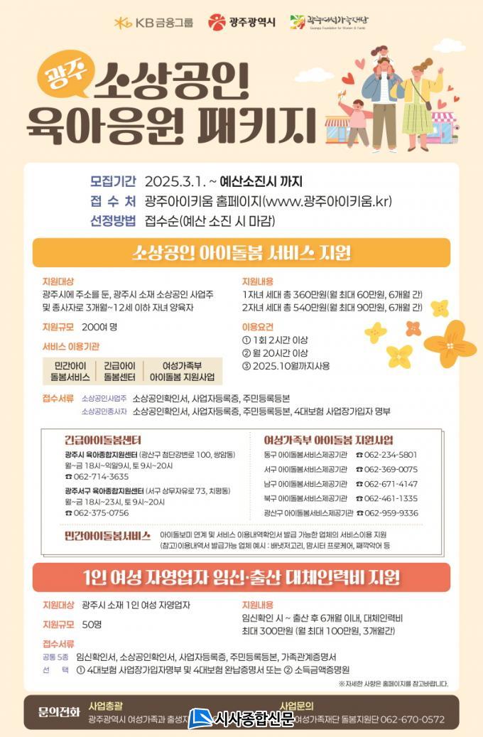±¤ÁÖ±¤¿ª½Ã(½ÃÀå °±âÁ¤)´Â KB±ÝÀ¶±×·ìÀÇ ÈÄ¿ø(»ç¾÷ºñ 10¾ï¿ø)À¸·Î 3°³¿ù~12¼¼ Àڳฦ µÐ Áö¿ª ¼Ò»ó°øÀÎ(»ç¾÷ÁÖ ¹× Á¾»çÀÚ)¿¡°Ô ¾ÆÀ̵¹º½¼ºñ½º ÀÌ¿ë·á¸¦, 1ÀÎ ¿©¼º ÀÚ¿µ¾÷ÀÚ¿¡°Ô´Â ÀÓ½Å‧Ãâ»ê ´ëüÀηºñ¸¦ Áö¿øÇÏ´Â ¡®±¤ÁÖ ¼Ò»ó°øÀÎ À°¾ÆÀÀ¿øÆÐŰÁö Áö¿ø»ç¾÷¡¯À» Áö³ÇØ 12¿ùºÎÅÍ ½ÃÇàÇϰí ÀÖ´Ù.