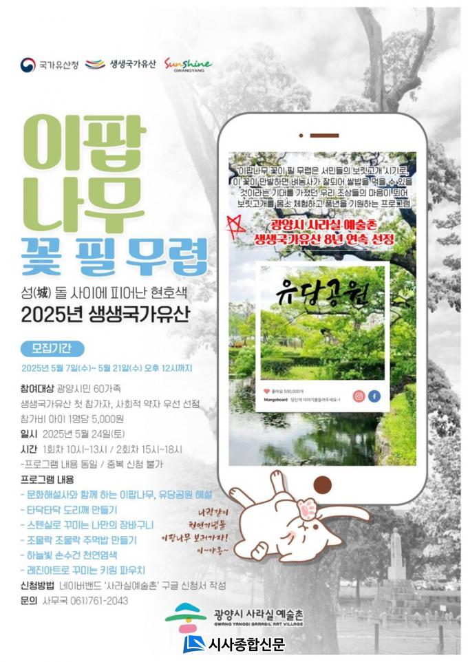 ù ¹øÂ° ÇÁ·Î±×·¥ÀÎ ¡®ÀÌÆË³ª¹« ²É ÇÊ ¹«·Æ¡¯Àº ¿À´Â 5¿ù 24ÀÏ, ¼ö·É 500³âÀÇ ÀÌÆË³ª¹«°¡ º¸Á¸µÈ ±¤¾çÀ¾ À¯´ç°ø¿ø¿¡¼ °³ÃֵȴÙ. À¯´ç°ø¿ø ³» ÀÌÆË³ª¹«´Â ±¤¾ç½ÃÀÇ ¼ÒÁßÇÑ Ãµ¿¬±â³ä¹°·Î, Å©±â¿Í ¿ª»çÀû °¡Ä¡°¡ ¶Ù¾î³ª Áö¿ªÀ» ´ëÇ¥ÇÏ´Â ÀÚ¿¬À¯»êÀ¸·Î ¼Õ²ÅÈù´Ù.
