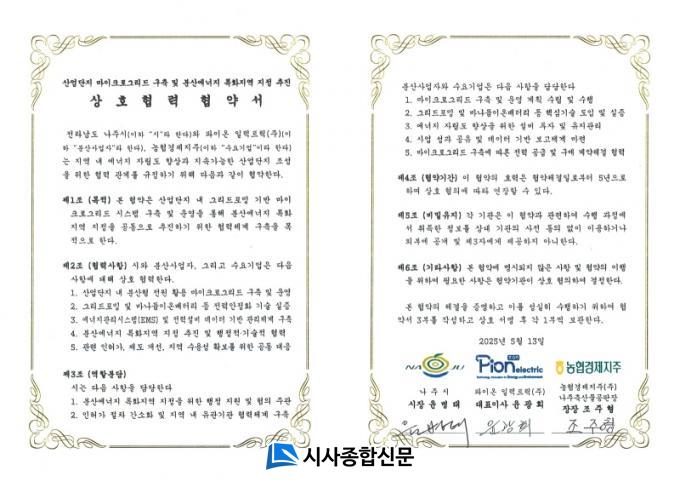 ³ªÁÖ½Ã(½ÃÀå À±º´ÅÂ)´Â ºÐ»ê¿¡³ÊÁö ƯÈÁö¿ª ÁöÁ¤ ¸ñÇ¥¿¡ µû¸¥ ICT ÷´Ü ½Å±â¼úÀ» Àû¿ëÇÑ ¸¶ÀÌÅ©·Î±×¸®µå ±¸Ãà ±â¹Ý Àü·Â°ø±Þ °èȹÀ» ¼ö¸³, Çõ½Å»ê´Ü ÀÔÁÖ±â¾÷ÀÎ ÆÄÀ̿ ÀÏ·ºÆ®¸¯(ÁÖ), ³óÇù°æÁ¦ÁöÁÖ¿Í »óÈ£Çù·Â ¾÷¹«Çù¾àÀ» ü°áÇß´Ù°í 15ÀÏ ¹àÇû´Ù.