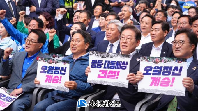 Á¦2ºÎ ¡®¹ÎÁÖÁÖÀÇ ´ëÃàÁ¦¡¯´Â ¹ÎÁÖÇ×Àï ½Â¸®ÀÇ ¿¸ÁÀ» ºÐÃâÇÏ´Â ÀåÀ¸·Î ±¤ÁÖ°øµ¿Ã¼ ȯ¿µÀλç, ¹ÂÁöÄà °ø¿¬, ½Ã¹Î¡¤Ã»¼Ò³â ¹ß¾ð°ú ÇÔ²² ¿À¿ù¹ÎÁÖ¼±¾ðÀÌ ¼±Æ÷µÆ´Ù. ÀÛ°î°¡ ±èÇü¼®ÀÇ ¡®À½¾ÇÀ¸·Î ¿À¿ù±¤ÁÖ¿¡ ÀüÇÏ´Â ÆòÈ¿Í Ä¡À¯ÀÇ ¸Þ½ÃÁö¡¯, °¡¼ö ÀÌÀº¹ÌÀÇ À§·Î¿Í ÀÀ¿øÀÇ ³ë·¡°¡ °ü°´µé¿¡°Ô Å« °¨µ¿À» ¼±»çÇß´Ù.