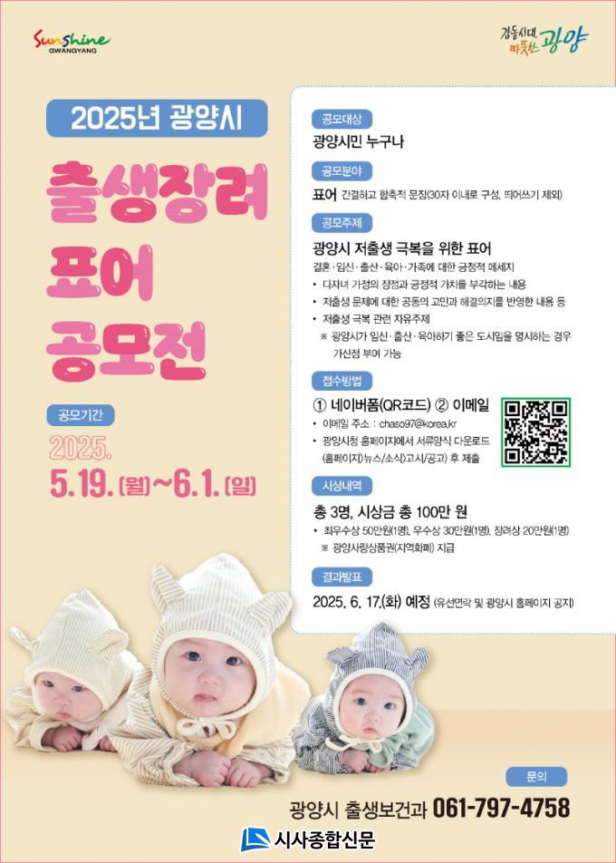 °ø¸ðÀü°ú °ü·ÃµÈ ÀÚ¼¼ÇÑ ³»¿ëÀº ±¤¾ç½Ãû ´©¸®Áý(ȨÆäÀÌÁö)ÀÇ °í½Ã¡¤°ø°í¶õ¿¡¼ È®ÀÎÇÒ ¼ö ÀÖÀ¸¸ç, ¹®ÀÇ´Â ±¤¾ç½Ãº¸°Ç¼Ò Ãâ»ýº¸°Ç°ú Ãâ»ýÁö¿øÆÀ(¢Ï061-797-4758)À¸·Î ÇÏ¸é µÈ´Ù.