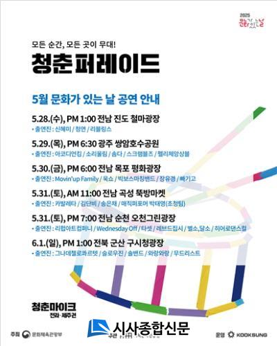 ±× ¿Ü¿¡µµ 5¿ù ûÃḶÀÌÅ© Àü¶ó±Ç °ø¿¬Àº Áö¿ªÀÇ °³¼º°ú °ø°£ÀÇ Æ¯»öÀ» »ì¸° ´Ùä·Î¿î ¹«´ë·Î À̾îÁø´Ù. 5¿ù 28ÀÏ(¼ö) Àü³² Áøµµ ö¸¶±¤Àå¿¡¼´Â ÀüÅë°ú ûÃáÀÌ ¾î¿ì·¯Áö´Â ¹«´ë ¡®Çѳ·ÀÇ Ã»Ãádz·ù¡¯°¡ ÆîÃÄÁö¸ç, 5¿ù 29ÀÏ(¸ñ)¿¡´Â ±¤ÁÖ ½Ö¾ÏÈ£¼ö°ø¿ø¿¡¼ ½Ã¹ÎÂü¿©Çü ÇÇÅ©´Ð ÄܼƮ ¡®Ã»Ãá Ç÷¹À̸®½ºÆ®!¡¯°¡ ÁøÇàµÇ°í, 5¿ù 30ÀÏ(±Ý) ¸ñÆ÷ Æòȱ¤Àå¿¡¼´Â ¡®Ã»Ãá ON AIR¡¯¶ó´Â À̸§ ¾Æ·¡, ¿ªµ¿ÀûÀÌ°í ¿¡³ÊÁö ³ÑÄ¡´Â ÆÛÆ÷¸Õ½º Áß½ÉÀÇ ¹«´ë°¡ °ü°´ÀÇ ¸ôÀÔÀ» ²ø¾î³¾ ¿¹Á¤ÀÌ´Ù.