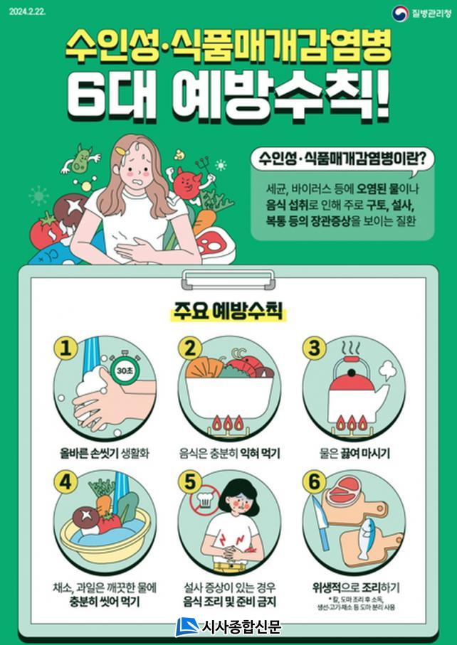 ¼öÀμº¡¤½Äǰ¸Å°³°¨¿°º´ ¹ß»ýÀ» ¿¹¹æÇϱâ À§Çؼ´Â¡ã¿Ã¹Ù¸¥ ¼Õ ¾Ä±â »ýȰÈ, ¡ãÀ½½ÄÀº ÃæºÐÈ÷ ÀÍÇô ¸Ô±â ¡ã¹°Àº ²ú¿© ¸¶½Ã±â ¡ãä¼Ò¡¤°úÀÏÀº ±ú²ýÇÑ ¹°¿¡ ÃæºÐÈ÷ ¾Ä¾î ¸Ô±â ¡ã¼³»ç Áõ»óÀÌ ÀÖ´Â °æ¿ì À½½Ä Á¶¸® ¹× Áغñ ±ÝÁö ¡ãÀ§»ýÀûÀ¸·Î Á¶¸®Çϱ⠵î 6´ë ¿¹¹æ¼öÄ¢À» ÁؼöÇØ¾ß ÇÑ´Ù.