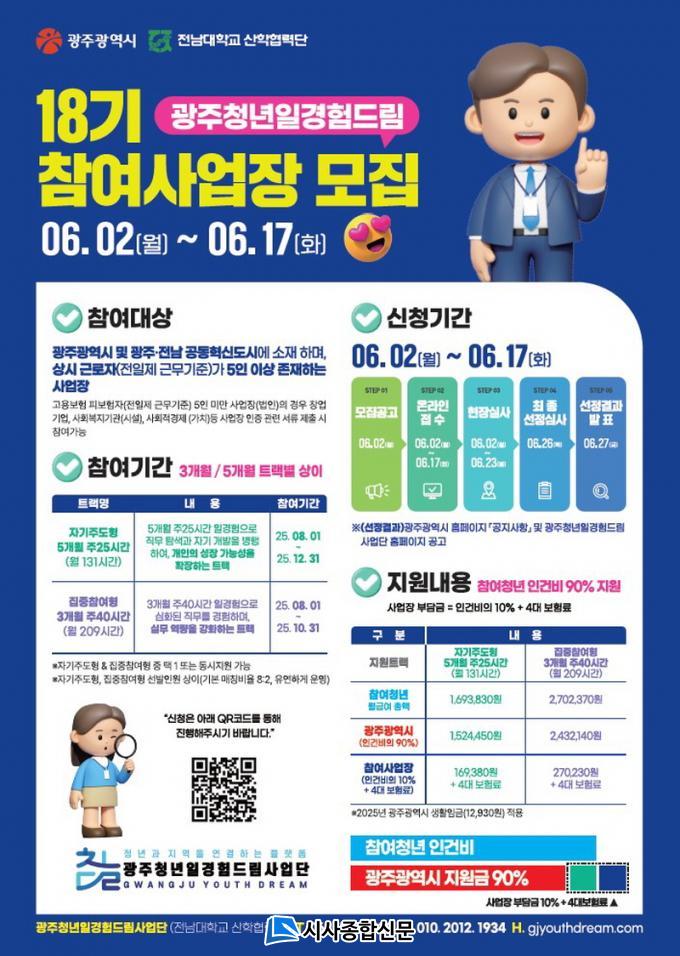 ¡®±¤ÁÖû³â ÀϰæÇèµå¸²¡¯Àº Áö¿ª û³âÀÌ ½ÇÁ¦ ±â¾÷ ÇöÀå¿¡¼ Á÷¹« ¿ª·®À» ½×°í, Áö¿ª»çȸ Âü¿©È°µ¿°ú Á÷¹«±³À°À» ÇÔ²² °æÇèÇÒ ¼ö ÀÖµµ·Ï ±¸¼ºµÈ ±¤Áֽà ´ëÇ¥ û³âÀÏÀÚ¸® Áö¿ø»ç¾÷ÀÌ´Ù. Áö³ 2017³âºÎÅÍ ¸Å³â »ó‧ÇϹݱ⠽ÃÇà, Áö±Ý±îÁö 5000¿© °³ »ç¾÷Àå°ú 7600¿© ¸íÀÇ Ã»³âÀÌ Âü¿©Çß´Ù.