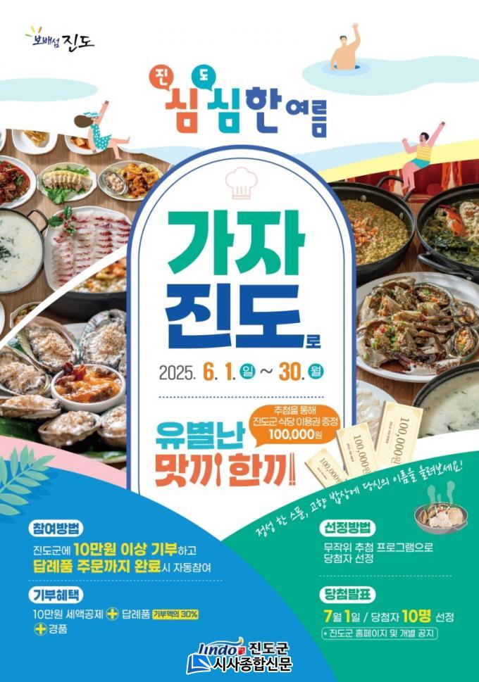 | Áøµµ±º, °íÇâ»ç¶û±âºÎÁ¦ ¿©¸§ÈÞ°¡ ¸ÂÀÌ Æ¯º°À̺¥Æ® ÁøÇà 6¿ù ÇÑ ´Þ°£ ±âºÎÀÚ ´ë»óÀ¸·Î Áøµµ °ü³» ½Ä´ç ÀÌ¿ë±Ç Á¦°ø |