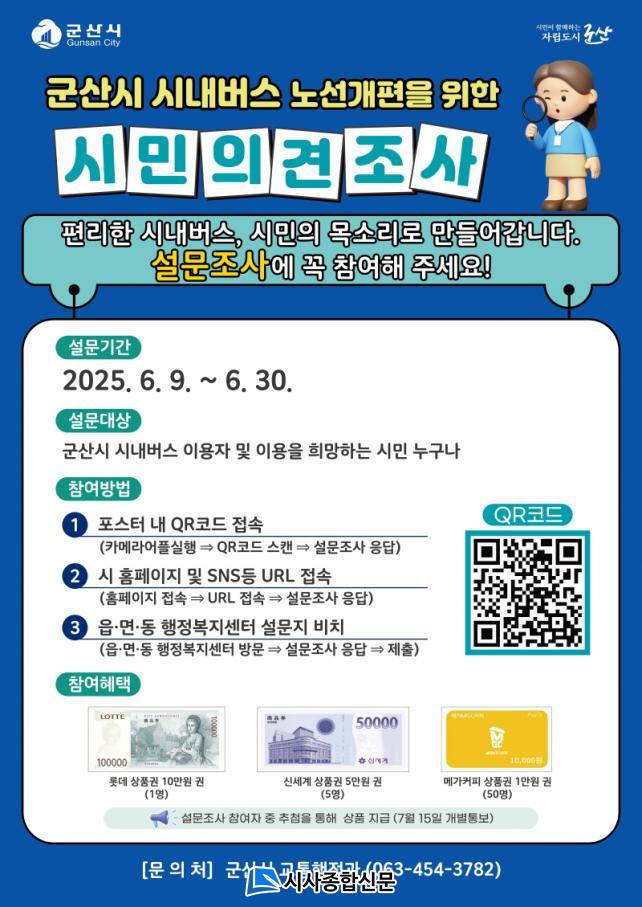 ¿Â¶óÀÎ ¼³¹®Á¶»ç´Â ±º»ê½Ãû ´©¸®Áý, ¹«»ó±³Åë ´©¸®Áý, °ø½Ä »çȸ°ü°è¸Á(SNS) µî¿¡¼ ¼³¹®Á¶»ç URL(https://naver.me/xBMdVQAO)À» ÅëÇØ Âü¿©ÇÏ¸é µÈ´Ù. ȤÀº ÁÖ¿ä ¹ö½ºÁ¤·ùÀå ¹× ½Ã³»¹ö½º Â÷·® ³» ºÎÂøµÈ ¼³¹®Á¶»ç È«º¸ Æ÷½ºÅÍ¿¡ ÀÖ´Â QRºÎÈ£(ÄÚµå)¸¦ ÅëÇØ¼µµ °£ÆíÇÏ°Ô ÀÀ´äÇÒ ¼ö ÀÖ´Ù.