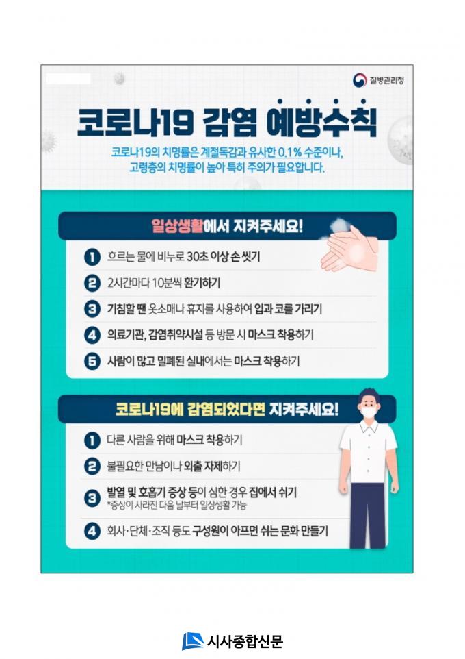 °¨¿°º´ ¿¹¹æÀ» À§Çؼ´Â ±âħ°ú Àçä±â¸¦ ÇÒ ¶§ ÈÞÁö³ª ¿Ê¼Ò¸Å·Î ÀÔ°ú ÄÚ¸¦ °¡¸®´Â ±âħ ¿¹ÀýÀ» ½ÇõÇϰí, ¼ÕÀº È帣´Â ¹°¿¡ ºñ´©·Î 30ÃÊ ÀÌ»ó ²Ä²ÄÈ÷ ¾Ä¾î¾ß ÇÑ´Ù.¶Ç ¾ÄÁö ¾ÊÀº ¼ÕÀ¸·Î ¾ó±¼ ÁÖÀ§¸¦ ¸¸ÁöÁö ¾Êµµ·Ï ÁÖÀÇÇØ¾ß ÇÑ´Ù.