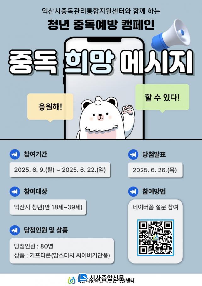 ÀÍ»ê½Ã´Â ÀÍ»ê½ÃÁßµ¶°ü¸®ÅëÇÕÁö¿ø¼¾ÅÍ(¼¾ÅÍÀå ÀÌÇö±â)¿Í ÇÔ²² û³â Áßµ¶ ¿¹¹æ°ú ȸº¹À» ÀÀ¿øÇÏ´Â 'Áßµ¶ Èñ¸Á ¸Þ½ÃÁö' Ä·ÆäÀÎÀ» ¿À´Â 22ÀϱîÁö ÁøÇàÇÑ´Ù°í 9ÀÏ ¹àÇû´Ù.