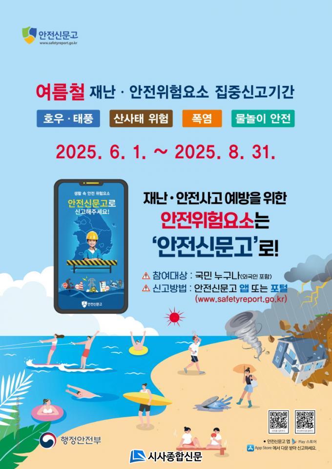 ¡®¾ÈÀü½Å¹®°í¡¯´Â ±¹¹Î ´©±¸³ª »ýȰ ÁÖº¯ÀÇ À糡¤¾ÈÀü À§Çè ¿ä¼Ò¸¦ »çÁøÀ̳ª µ¿¿µ»óÀ¸·Î ÃÔ¿µÇØ ½Å°íÇÒ ¼ö ÀÖ´Â ½Ã½ºÅÛÀ¸·Î, ¿©¸§Ã¶ ÀÚÁÖ ¹ß»ýÇÏ´Â ¡ãÈ£¿ì¡¤ÅÂdz ¡ã»ê»çÅ À§Çè ¡ãÆø¿° ¡ã¹°³îÀÌ ¾ÈÀü µî 4°³ À¯ÇüÀÇ »ç°í ¿¹¹æÀ» À§ÇØ °ü·Ã ½Å°í¸¦ ¹Þ°í ÀÖ´Ù.