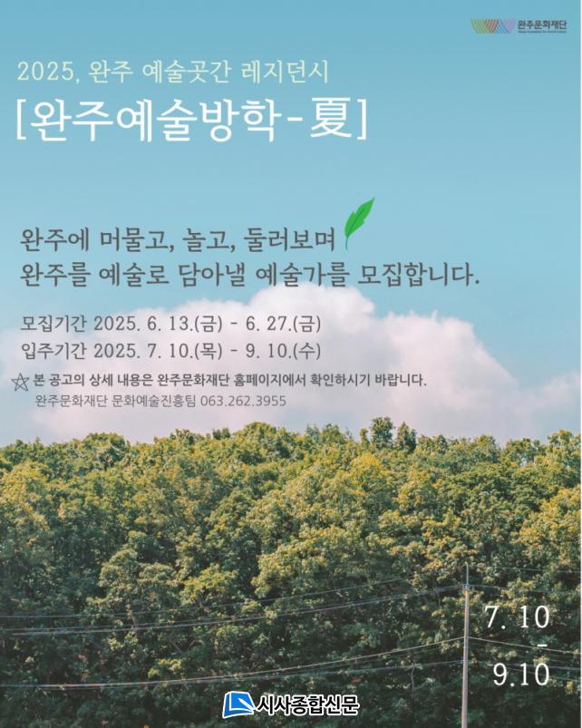 [½Ã»çÁ¾ÇսŹ® = ¿À½ÂÅà ±âÀÚ] (Àç)¿ÏÁÖ¹®ÈÀç´Ü(ÀÌ»çÀå À¯ÈñÅÂ)Àº Áö¿ª ¿¹¼ú Ȱ¼ºÈ¸¦ À§ÇÑ ·¹Áö´ø½Ã ÇÁ·Î±×·¥ 2025 [¿ÏÁÖ¿¹¼ú¹æÇÐ-ù¾]ÀÇ Âü°¡ ¿¹¼úÀÎÀ» ¸ðÁýÇÑ´Ù. ÀÌ »ç¾÷Àº ¿ÏÁÖ¿¹¼ú°÷°£À» °ÅÁ¡À¸·Î ¿î¿µµÇ¸ç, ¿¹¼úÀο¡°Ô âÀÛ °ø°£°ú ¼÷¼Ò, Áö¿ø±ÝÀ» Á¦°øÇϰí, Áö¿ª ÀÚ¿øÀ» Ȱ¿ëÇÑ ÇÁ·ÎÁ§Æ®¸¦ ÅëÇØ ÁֹΰúÀÇ ¼ÒÅëÇÏ´Â °ÍÀ» ¸ñÇ¥·Î ÇÑ´Ù.