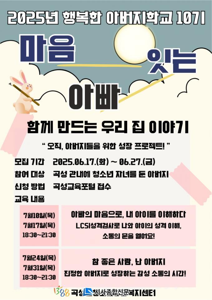 ¡®ÇູÇÑ ¾Æ¹öÁöÇб³¡¯´Â °î¼º Áö¿ª ¾Æ¹öÁöµéÀ» À§ÇÑ Àü¹® ±³À° ÇÁ·Î±×·¥À¸·Î ÀÚ³à¿ÍÀÇ °ü°è ȸº¹°ú °Ç°ÇÑ °¡Á·¹®È Á¶¼ºÀ» Áö¿øÇϱâ À§ÇØ 2016³âºÎÅÍ ²ÙÁØÈ÷ ¿î¿µµÇ°í ÀÖ´Ù. ¿ÃÇØ·Î 10±â¸¦ ¸ÂÀÌÇÏ´Â º» ÇÁ·Î±×·¥Àº Áö¿ª ³» ¾Æ¹öÁö ±³À°ÀÇ ´ëÇ¥ÀûÀÎ »ç·Ê·Î ÀÚ¸®¸Å±èÇß´Ù.