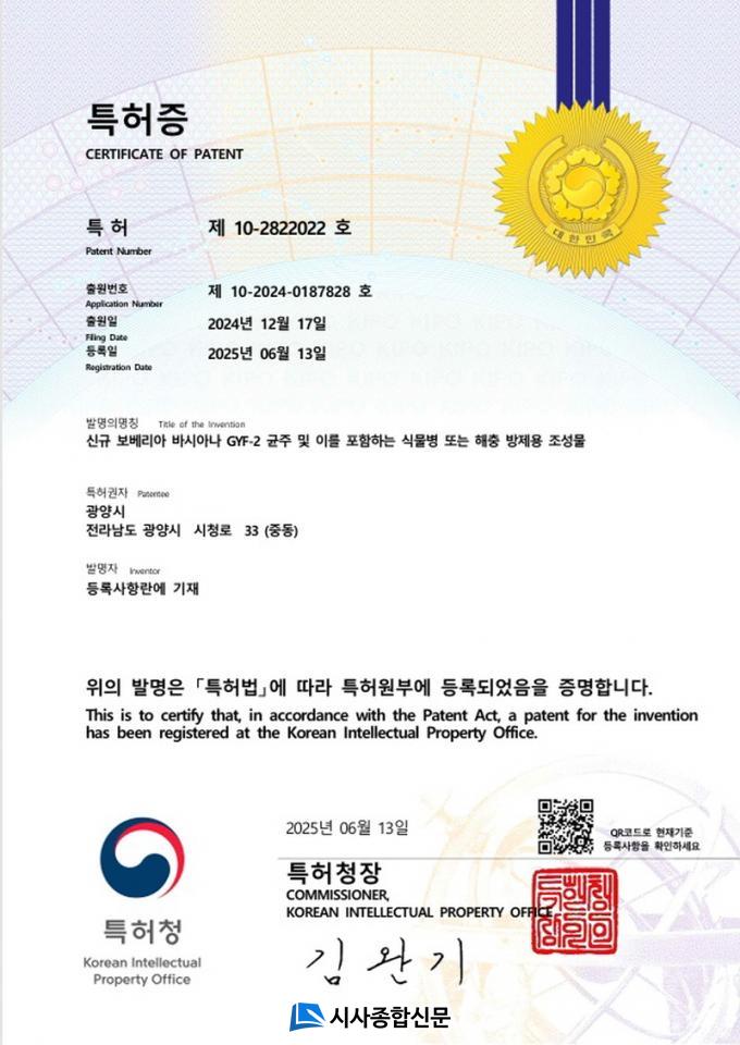 ±¤¾ç½Ã(½ÃÀå Á¤ÀÎÈ)´Â 2024³â 7¿ùºÎÅÍ 2025³â 6¿ù±îÁö ¼öÇàÇÑ ¡®¹é¿î»ê ÀÚ»ý °ïÃæº´¿ø¼º ¹Ì»ý¹° ¿¬±¸°³¹ß »ç¾÷¡¯À» ¼º°øÀûÀ¸·Î ¸¶¹«¸®Çϰí, ±× ¼º°ú¸¦ ÀÎÁ¤¹Þ¾Æ Áö³ 6¿ù 13ÀÏ ¡®¹é±¤ÀÌ(Beauveria bassiana GYF-2)¡¯¿¡ ´ëÇÑ Æ¯Çãµî·Ï(µî·Ï¹øÈ£ Á¦10-2822022È£)À» ¿Ï·áÇß´Ù°í 20ÀÏ ¹àÇû´Ù.