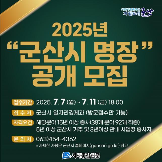 Áö³ 2021³â Á¦1´ë ¸íÀåÀ» ½ÃÀÛÀ¸·Î ½ÃÇàÁßÀÎ ±º»ê½Ã ¸íÀå Á¦µµ´Â Áö±Ý±îÁö 5°³ Á÷Á¾(Á¶¸®, ¹Ì¿ë, Á¦°ú¡¤Á¦»§, ÈÈÑÀå½Ä, Àá¼ö) 6¸íÀÇ ±º»ê½Ã ¸íÀåÀ» ¼±Á¤ÇÏ¿´´Ù. ¼±Á¤µÈ ¸íÀåµéÀº ÇöÀç Áö¿ª ¼÷·Ã ±â¼ú ¹ßÀü°ú °è½ÂÀ» À§ÇÏ¿© ½Å±â¼ú °³¹ß, Áö¿ª»çȸ Àç´É±âºÎ, ±â¼ú °ÀÇ, ÈÄÇÐ ¾ç¼º¿¡ ¸ÅÁøÇϰí ÀÖ´Ù.