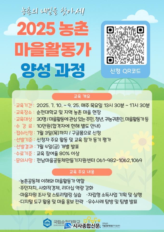 ±³À°Àº 2025³â 7¿ù 10ÀϺÎÅÍ 9¿ù 25ÀϱîÁö ¸ÅÁÖ ¸ñ¿äÀÏ¿¡ ÁøÇàµÇ¸ç, ±¹¸³¼øÃµ´ëÇб³ º» Ä·ÆÛ½º¿Í Àü³² Áö¿ª ³óÃÌ ¸¶À» ÇöÀåÀ» ¿À°¡¸ç À̷аú ½Ç½ÀÀ» º´ÇàÇÑ´Ù. ¿ÀÈÄ 1½Ã 30ºÐºÎÅÍ 5½Ã 30ºÐ±îÁö ÃÑ 12ȸÂ÷·Î ±¸¼ºµÈ ÇÁ·Î±×·¥Àº ¸¶À» Ȱµ¿¿¡ ÇÊ¿äÇÑ ½Çõ ¿ª·®À» ü°èÀûÀ¸·Î ÇÔ¾çÇÒ ¼ö ÀÖµµ·Ï ¼³°èµÇ¾ú´Ù.