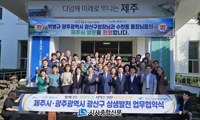 À̳¯ Á¦ÁÖ½Ãû¿¡¼ ¿¸° Çù¾à½Ä¿¡´Â ¹Úº´±Ô ±¤»ê±¸Ã»Àå, ±è¿Ï±Ù Á¦ÁÖ½ÃÀå, µÎ Áö¿ª ±³·ùÀÇ ¹°²¿¸¦ ư ±¤»ê±¸ ¼ö¿Ïµ¿°ú Á¦Áֽà ¿¬µ¿ÀÇ ÁֹδëÇ¥°¡ ÇÔ²²Çß´Ù.