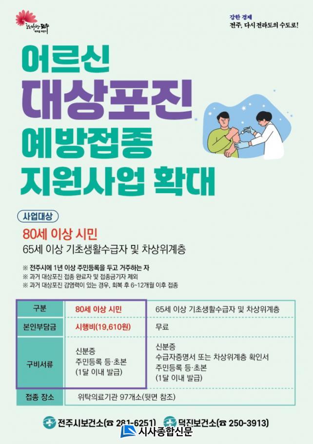 ÀüÁֽú¸°Ç¼Ò(¼ÒÀå ±è½Å¼±)´Â ÀÌ´ÞºÎÅÍ ´ë»óÆ÷Áø ¿¹¹æÁ¢Á¾ »ç¾÷ ´ë»óÀÚ¸¦ ±âÁ¸ 65¼¼ ÀÌ»ó ±âÃÊ»ýȰ¼ö±ÞÀÚ¿Í Â÷»óÀ§°èÃþÀ» Æ÷ÇÔÇÑ 80¼¼ ÀÌ»ó ¸ðµç ½Ã¹Î±îÁö È®´ëÇØ ½ÃÇàÇÑ´Ù°í 1ÀÏ ¹àÇû´Ù.