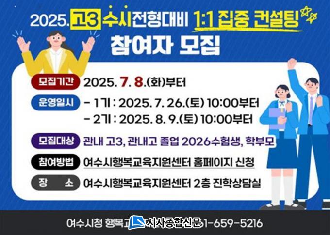 ¿©¼ö½ÃÇູ±³À°Áö¿ø¼¾ÅÍ ÁøÇÐ »ó´ã½Ç¿¡¼ ¿À´Â 7¿ù 26Àϰú 8¿ù 9ÀÏ ÃÑ 2ȸ¿¡ °ÉÃÄ 1Àδç 1ȸ 60ºÐ°£ 1:1 ¸ÂÃã »ó´ãÀ¸·Î ÁøÇàµÉ ¿¹Á¤ÀÌ´Ù.