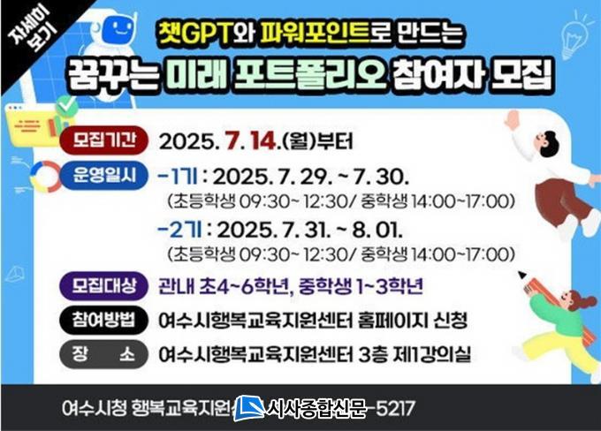 ÇÁ·Î±×·¥Àº 1±â(7¿ù 29ÀÏ, 30ÀÏ)¿Í 2±â(7¿ù 31ÀÏ, 8¿ù 1ÀÏ)·Î ³ª´² ¿î¿µµÈ´Ù. ±³À°Àº ¿©¼ö½ÃÇູ±³À°Áö¿ø¼¾ÅÍ 3Ãþ Á¦1°Àǽǿ¡¼ ÁøÇàµÇ¸ç, °»ç´Â AI ¹× ÄÄÇ»ÅÍ ºÐ¾ßÀÇ Àü¹® °»ç·Î ±¸¼ºÇß´Ù.
