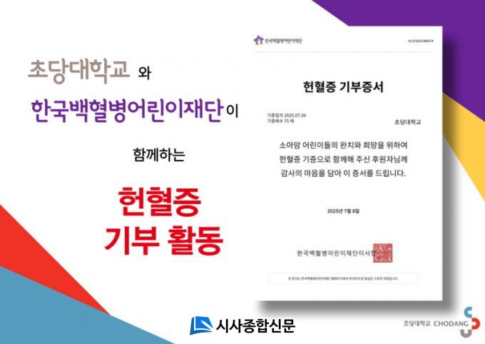 [½Ã»çÁ¾ÇսŹ® = ¿À½ÂÅà ±âÀÚ] ÃÊ´ç´ëÇб³´Â Áö³ 7¿ù 4ÀÏ Çѱ¹¹éÇ÷º´¾î¸°ÀÌÀç´Ü¿¡ ÇåÇ÷Áõ 75¸Å¸¦ ±âºÎÇÏ¸ç ¼Ò¾Æ¾Ï ¾î¸°À̵éÀÇ Ä¡·á¿Í ¿ÏÄ¡¸¦ À§ÇÑ ¶æ±íÀº ³ª´®¿¡ µ¿ÂüÇß´Ù.