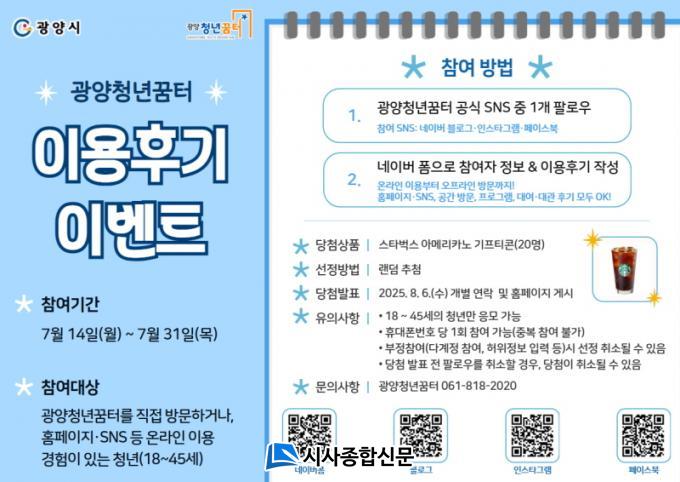 Âü¿© ¹æ¹ýÀº °£´ÜÇÏ´Ù. ±¤¾çû³â²ÞÅÍ °ø½Ä SNS(³×À̹ö ºí·Î±×, ÀνºÅ¸±×·¥, ÆäÀ̽ººÏ) Áß Çϳª¸¦ ÆÈ·Î¿ìÇÑ ÈÄ, °ø°£ ÀÌ¿ëÀ̳ª ÇÁ·Î±×·¥ Âü¿©, ȨÆäÀÌÁö¡¤SNS ÄÜÅÙÃ÷ Ȱ¿ë µî°ú °ü·ÃµÈ Èı⸦ ÀÚÀ¯·Ó°Ô ÀÛ¼ºÇØ ÆÈ·Î¿ì ÀÎÁõ°ú ÇÔ²² ³×À̹ö ÆûÀ¸·Î Á¦ÃâÇÏ¸é µÈ´Ù.