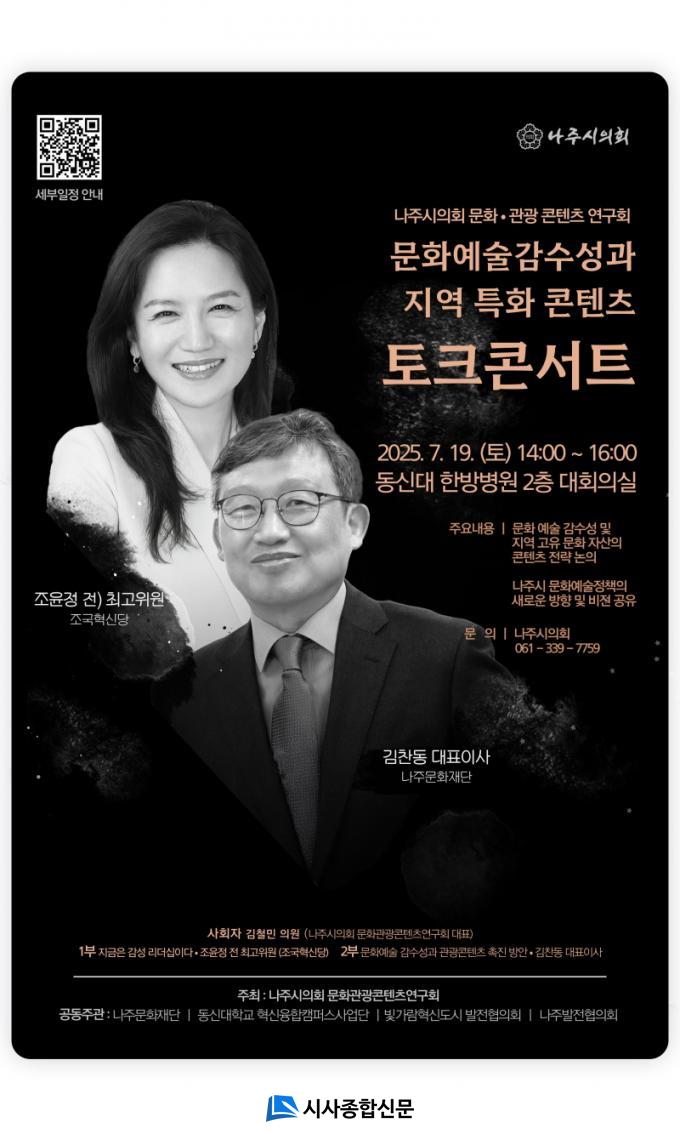 [½Ã»çÁ¾ÇսŹ® = ¿À½ÂÅà ±âÀÚ] ³ªÁÖ½ÃÀÇȸ´Â ¿À´Â 7¿ù 19ÀÏ(Åä) ¿ÀÈÄ 2½Ã, ºû°¡¶÷µ¿ µ¿½Å´ë Çѹ溴¿ø ´ë°´ç¿¡¼ ³ªÁÖ½ÃÀÇȸ ¹®È°ü±¤ÄÜÅÙÃ÷¿¬±¸È¸(´ëÇ¥ÀÇ¿ø ±èö¹Î)°¡ ÁÖÃÖÇÏ´Â ¡®°¨¼º ¸®´õ½Ê & Áö¿ª¹®ÈƯ»ö ÅäÅ©ÄܼƮ¡¯°¡ ¿¸°´Ù.