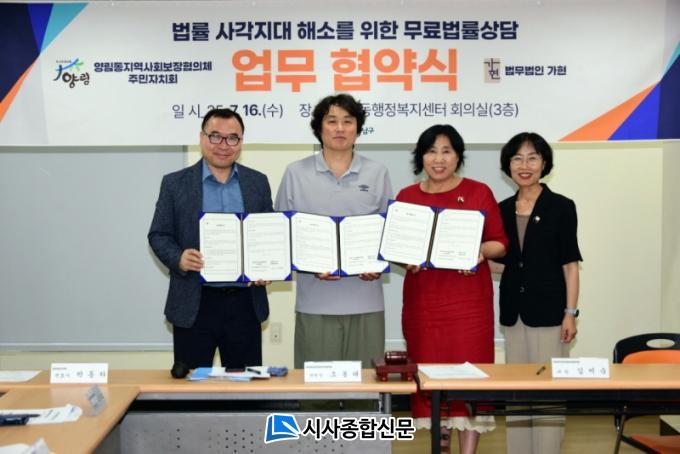 ¾ç¸²µ¿ ÇàÁ¤º¹Áö¼¾ÅÍ¿¡¼ ¿¸° ¾÷¹«Çù¾à½Ä¿¡´Â Á¶ºÀÅ Áö¿ª»çȸº¸ÀåÇùÀÇü ȸÀå, ±è¹Ì¼÷ ÁÖ¹ÎÀÚġȸÀå, ¹Úµ¿ÇÏ ´ëÇ¥º¯È£»ç, ¾ç¸²µ¿ ÇàÁ¤º¹Áö¼¾ÅÍ ¿ÀÀº°æ µ¿ÀåÀÌ Âü¼®ÇßÀ¸¸ç, ¹«·á ¹ý·ü »ó´ãÀ» ÅëÇØ Áö¿ª ÁÖ¹ÎÀÇ ¹ý·ü »ç°¢Áö´ë¸¦ ÇØ¼ÒÇϰí ÁÖ¹ÎÀÇ ÇູÇÑ »î°ú Áö¿ª¹ßÀüÀ» À§ÇØ ³ë·ÂÇϱâ·Î ÇÕÀÇÇß´Ù.